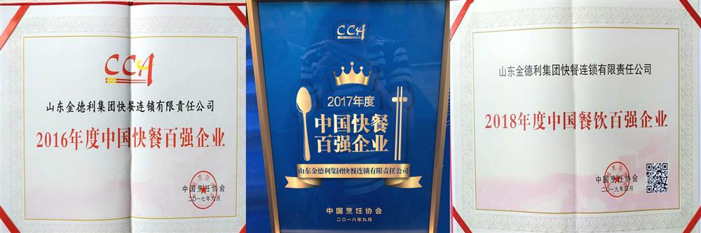 17年度全球现代快餐餐饮前百强行业(全球现代烹调协会会员,2017.9) 2018年度国内餐饮前十强品牌(国内烹调促进会,2018.9) 2015年度全国现代饮食top100企业公司 (全国现代烹调医学会,2019.4)
